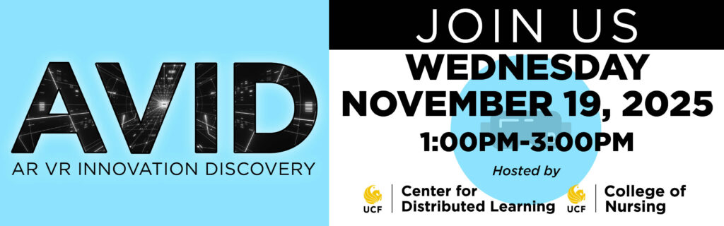 The Division of Digital Learning’s Faculty Multimedia Center (FMC) and Pegasus Innovation Lab (iLab) will be hosting events in partnership with departments and colleges around UCF. The AVID (AR VR Innovation Discovery) events aim to promote the growth of a vibrant community of professionals within the VR and AR space. AVID will offer a platform for the sharing of real-world use cases and research through interactive tech demonstrations and presentations.